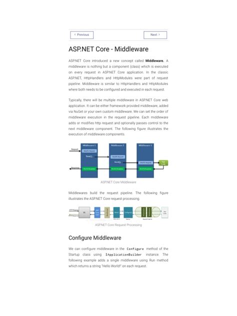 Let’s drill down a bit more into that RequestDelegate . Guys, this is the secret sauce that makes the middleware pipeline actually work . A RequestDelegate is essentially a function that takes an HttpContext and returns a Task . It represents the rest of the middleware pipeline, including the final endpoint that will handle the request. When a piece of middleware is executed, it’s given this RequestDelegate representing all the middleware components that come after it. So, if your middleware wants to allow the request to continue processing, it calls this RequestDelegate delegate. This effectively passes the HttpContext to the next middleware in line. If the middleware doesn’t call the RequestDelegate , the pipeline effectively stops at that point, and no further middleware or the endpoint will be executed for that request. This is how you can implement middleware that might, for instance, check if a user is authenticated. If they aren’t, the middleware can terminate the request by sending back a 401 Unauthorized response without ever reaching the code that handles the actual resource requested. Conversely, if the user is authenticated, the middleware would call the RequestDelegate to pass the request along to the next component. This chaining mechanism is super elegant and allows for highly modular and composable applications. You build your complex request handling logic by simply composing smaller, independent middleware components. It’s like building with LEGOs – each brick is a piece of middleware, and you connect them in the desired order to create your structure.