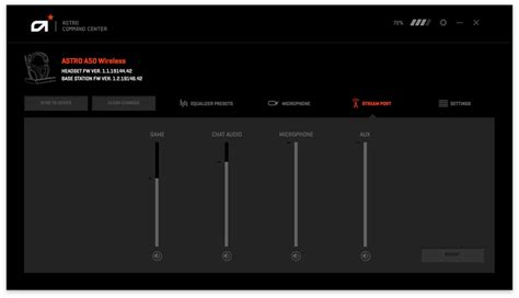 Configuring the stream port settings on your Astro A50 involves using the Astro Command Center software. Within the software, you can adjust the levels of different audio sources that are sent to the stream output. This includes game audio, voice chat, and auxiliary audio. Balancing these levels ensures that your stream sounds professional and that no single audio source overpowers the others.