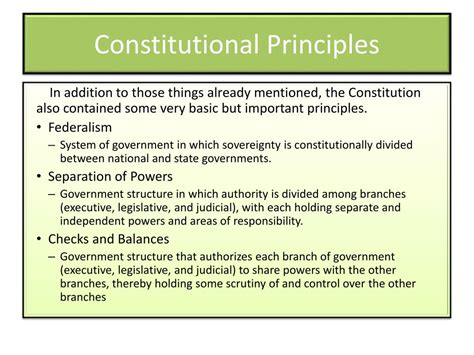 Limited Government is perhaps the most fundamental principle. It dictates that the government’s power is not absolute but is restricted by a set of laws and a constitution. This prevents tyranny and ensures that the government cannot arbitrarily interfere in the lives of individuals. In a constitutional system, the government’s authority is derived from the people, and it can only exercise powers that are explicitly granted to it. This principle is often enshrined in the constitution through enumerated powers, which specify the areas in which the government can act, and reserved powers, which are retained by the states or the people. Limited government fosters individual autonomy and promotes a society where people are free to pursue their own goals and interests without undue interference from the state.