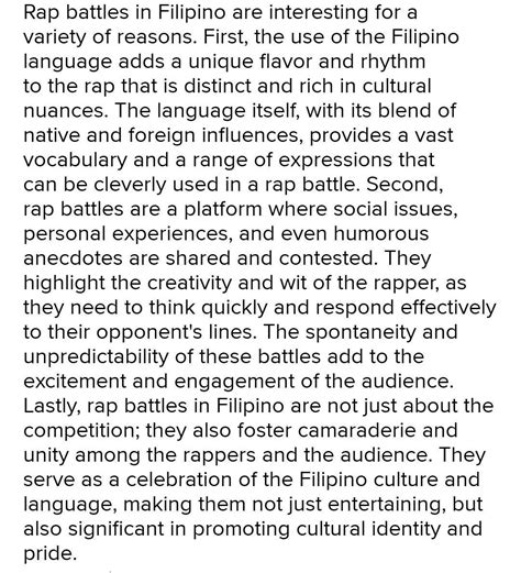 Pinoy rap battles are more than just entertainment; they are a cultural phenomenon . They provide a platform for Filipinos to express their views on social and political issues . They also serve as a form of social commentary , challenging the status quo and sparking important conversations. Pinoy rap battles have also played a significant role in the development of Filipino hip-hop. They have helped to popularize the genre and create a unique Filipino sound . They have also provided a platform for aspiring rappers to showcase their talent and gain recognition. To understand the cultural significance of Pinoy rap battles , you need to consider the historical context. The Philippines has a long history of oral tradition and storytelling . Pinoy rap battles are a modern-day manifestation of this tradition. They are a way for Filipinos to express their thoughts and feelings in a creative and engaging way. They are also a way to connect with their culture and heritage. Pinoy rap battles are a powerful force in Philippine society. They are a source of entertainment, a form of social commentary, and a platform for cultural expression. By understanding the cultural significance of Pinoy rap battles , you’ll gain a deeper appreciation for the art form and its impact on Philippine society. They allow for freedom of speech, even if that speech is harsh and critical. This is a valuable outlet in a society where opinions are sometimes suppressed. Ultimately, diving into the world of Philippine rap battles is like unlocking a whole new level of understanding of Filipino culture. It’s challenging, it’s fast-paced, but it’s incredibly rewarding. So, are you ready to give it a try? Tara ! (Let’s go!)