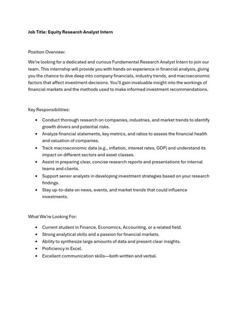 One of the main things you’ll be doing is data collection and analysis . This means gathering financial statements, market data, and industry reports. You’ll use this information to build financial models, analyze company performance, and identify trends. It’s like being a financial archaeologist, piecing together the past to predict the future! Another crucial aspect is company and industry research . This involves studying the business models, competitive landscapes, and regulatory environments of specific companies and industries. This might include reading annual reports, attending investor presentations, and talking to industry experts. The aim is to get a deep understanding of the investment landscape. You will also get hands-on experience by writing reports and presentations . These documents summarize your findings, explain your investment recommendations, and present them in a clear and concise manner. This includes creating compelling visuals and charts.
