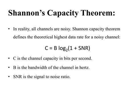 Okay, so Shannon didn’t just pull this number out of a hat. The Channel Capacity Theorem is underpinned by some elegant mathematics. For a specific type of channel, known as the Additive White Gaussian Noise (AWGN) channel , which is a pretty common model for many real-world scenarios, the capacity is given by a beautiful formula: C = W log2(1 + S/N).