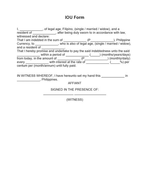 So there you have it! IOU examples , explanations, and everything you need to know to start using them effectively. Remember, IOUs are great for simple, informal debts among trusted parties. But for larger sums or complex situations, stick with a formal loan agreement. Happy lending! In summary, IOUs are a valuable tool for managing debts in informal settings, providing a simple and effective way to document financial obligations. By understanding the key elements of an IOU, when to use it, and its limitations, you can effectively manage debts and maintain positive relationships with those involved. Remember to tailor the IOU to the specific circumstances of the debt, include all relevant details, and consider having it witnessed for added credibility. While IOUs are not a substitute for formal loan agreements, they can be a useful alternative in situations where a more comprehensive contract seems unnecessary. However, it’s important to recognize the limitations of IOUs and opt for formal contracts when dealing with significant amounts or complex terms. By following these guidelines, you can ensure that your financial transactions are properly documented and legally protected. As you navigate the world of IOUs, remember to prioritize transparency, accuracy, and clear communication. By fostering these qualities, you can create a positive and productive environment for managing debts and maintaining strong relationships with friends, family, and business associates. Whether you’re lending money to a friend or acknowledging payment for services rendered, IOUs can help you stay organized and accountable. So go ahead and start using IOUs to simplify your financial transactions and promote trust and understanding. Just remember to always exercise caution and seek professional advice when dealing with complex or high-value debts. With the right approach, IOUs can be a valuable asset in your financial toolkit. Remember, IOUs are great for simple, informal debts among trusted parties. But for larger sums or complex situations, stick with a formal loan agreement. Happy lending!