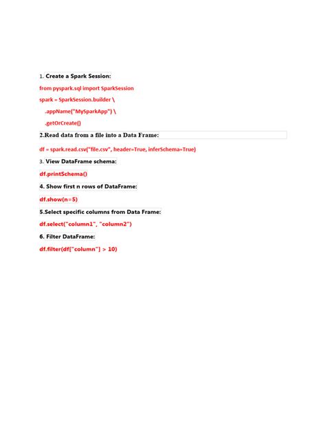 Once your data is loaded into a DataFrame, that’s where the real fun begins! DataFrames are the workhorse of Apache Spark’s high-level APIs, and understanding how to manipulate them is key. You’ll be using a whole suite of Apache Spark basic commands to transform, filter, and analyze your data. Let’s talk about some of the most common operations. First up, viewing your data. After loading, you’ll want to see what you’ve got. The .show() command is your best friend here. Simply call yourDataFrame.show() to display the first 20 rows of your DataFrame. Need to see more? Use yourDataFrame.show(numRows=50) to show 50 rows. Next, selecting specific columns is super common. You use .select() for this. For example, yourDataFrame.select("column1", "column2") will give you a new DataFrame containing only column1 and column2 . You can also rename columns during selection using .alias() : yourDataFrame.select(col("oldName").alias("newName")) . Filtering data is another essential task. The .filter() or .where() commands let you specify conditions. yourDataFrame.filter(yourDataFrame("age") > 30) keeps only the rows where the ‘age’ column is greater than 30. You can combine multiple conditions using & (AND) and | (OR). For more complex transformations, like creating new columns based on existing ones, you use .withColumn() . For example, yourDataFrame.withColumn("newColumn", yourDataFrame("col1") * 2) creates a new column named newColumn by multiplying col1 by 2. Grouping and aggregating data is also super powerful. You use .groupBy() followed by an aggregation function like .count() , .sum() , .avg() , etc. yourDataFrame.groupBy("category").count() will count the number of rows for each unique category. These DataFrame operations are lazy , meaning Spark doesn’t execute them immediately. It builds up a plan, and only when you trigger an action (like .show() or .write() ) does Spark actually run the computations. This lazy evaluation is a key optimization technique in Spark, allowing it to optimize the entire execution plan. Mastering these basic DataFrame transformations is fundamental to using Spark effectively, guys. It’s how you slice, dice, and make sense of your big data.