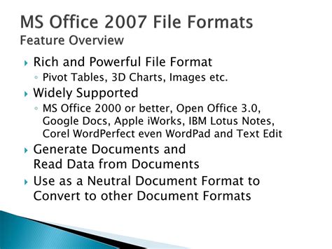 As touched upon earlier, one of the most significant technical advancements in Microsoft Office 2007 was the shift to new file formats based on Office Open XML (OOXML). For Word, this meant moving from .doc to .docx ; for Excel, from .xls to .xlsx ; and for PowerPoint, from .ppt to .pptx . These new formats were essentially ZIP archives containing XML files and other data. Why was this such a big deal, you ask? Well, several reasons, guys. Firstly, file sizes were significantly reduced . Compressing the data into a ZIP archive meant your documents, spreadsheets, and presentations took up less space on your hard drive and were faster to transfer over networks or email. Secondly, data integrity and recoverability were improved . The XML structure made files more robust. If a file became corrupted, it was often easier to recover the intact parts of the document compared to the older binary formats. Thirdly, interoperability was enhanced . While compatibility with older versions required a download pack, the open nature of XML made it theoretically easier for other applications to read and write Office files, fostering better integration within the broader software ecosystem. However, this transition wasn’t without its challenges. Users of older versions of Office (prior to 2007) couldn’t open these new .docx , .xlsx , or .pptx files without installing the Microsoft Office Compatibility Pack . This caused some friction and required users to be mindful of who they were sharing files with. For those who needed to maintain compatibility with older systems, saving documents in the older .doc format was still an option, but it meant sacrificing the benefits of the new XML structure. The shift to OOXML was part of a broader industry trend towards open standards and interoperability, and Microsoft’s adoption of it in Office 2007 marked a significant step in that direction. It represented a move towards a more modern, efficient, and resilient way of storing and managing documents, setting the stage for how productivity software would handle data in the years to come. The implications of this change extended beyond just the end-user; it also impacted developers and IT professionals who had to adapt to the new file structures and understand how they worked. This was a fundamental modernization of the Office suite’s file handling capabilities, aligning it with contemporary data management practices and ensuring its relevance in an increasingly interconnected digital world. The benefits of smaller, more stable, and more accessible files were substantial, making it a worthwhile, albeit sometimes challenging, upgrade for many organizations and individuals. It was a bold move that solidified Office 2007’s place as a transitional and transformative version in the suite’s history, paving the way for future developments in document technology and collaboration.