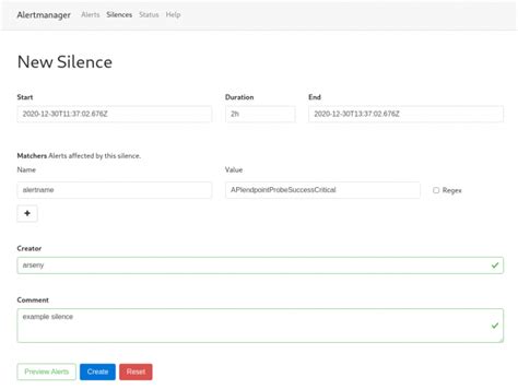 Next, we have the Silences section – a truly indispensable feature for managing alert fatigue during planned maintenance or known outages. Here, you can view all active, pending, and expired silences. Creating a new silence is straightforward: you define a set of matchers (labels) that an alert must have for the silence to apply, specify a start and end time, and optionally add a comment and creator. For example, if you’re taking down a database server for an upgrade, you can create a silence that matches alerts from that specific server (`instance=