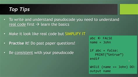 See? It’s pretty intuitive. You’re telling the computer (or whoever is reading this) exactly what to do, step by step. The DISPLAY command means show something on the screen, INPUT means get some information from the user, and + is used to combine text. The START and END clearly mark the boundaries of our program. Consistency is key , though. If you decide to use DISPLAY for output, stick with it. Don’t switch to PRINT in the next step unless you have a good reason. This makes your pseudocode predictable and easier to follow. Also, don’t get too caught up in the details. Pseudocode isn’t about optimizing for speed or memory; it’s about outlining the logic. Avoid writing overly complex sentences. Break down each step into its smallest logical component. For example, instead of Calculate total price including tax and apply discount , you might break it down into: