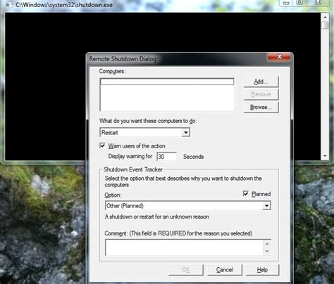 • -r : Restarts the computer instead of shutting it down. Use this option when you need to reboot a system remotely.