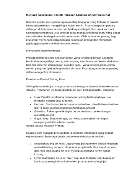Dengan memperhatikan kebiasaan hidup sehari-hari, kita bisa menciptakan lingkungan yang mendukung kesehatan prostat. Ini termasuk menjaga pola tidur yang baik, mengelola stres, menjaga kebersihan diri, dan menghindari kebiasaan buruk yang bisa membahayakan prostat. Ingat, perubahan kecil dalam kebiasaan sehari-hari bisa memberikan dampak besar pada kesehatan prostat. So, take care of your lifestyle, guys!